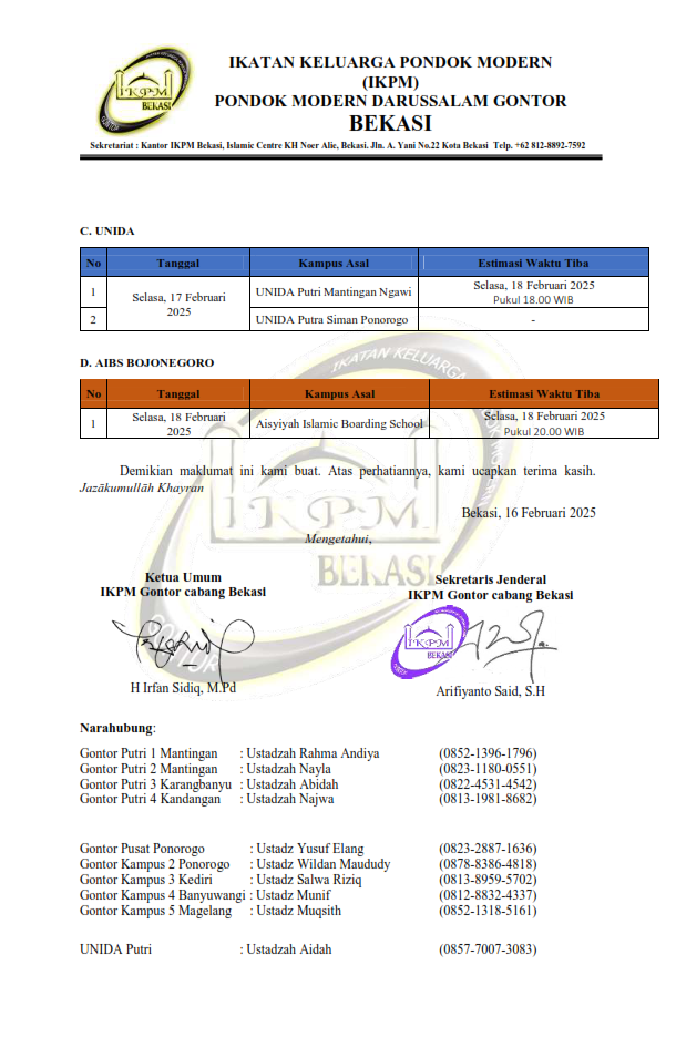 Berikut kami sampaikan Informasi terkait kedatangan Santri Putra dan Santri Putri dari Pondok ke Bekasi di tanggal Kamis-Jum’at, 28-29 Agustus 2025: