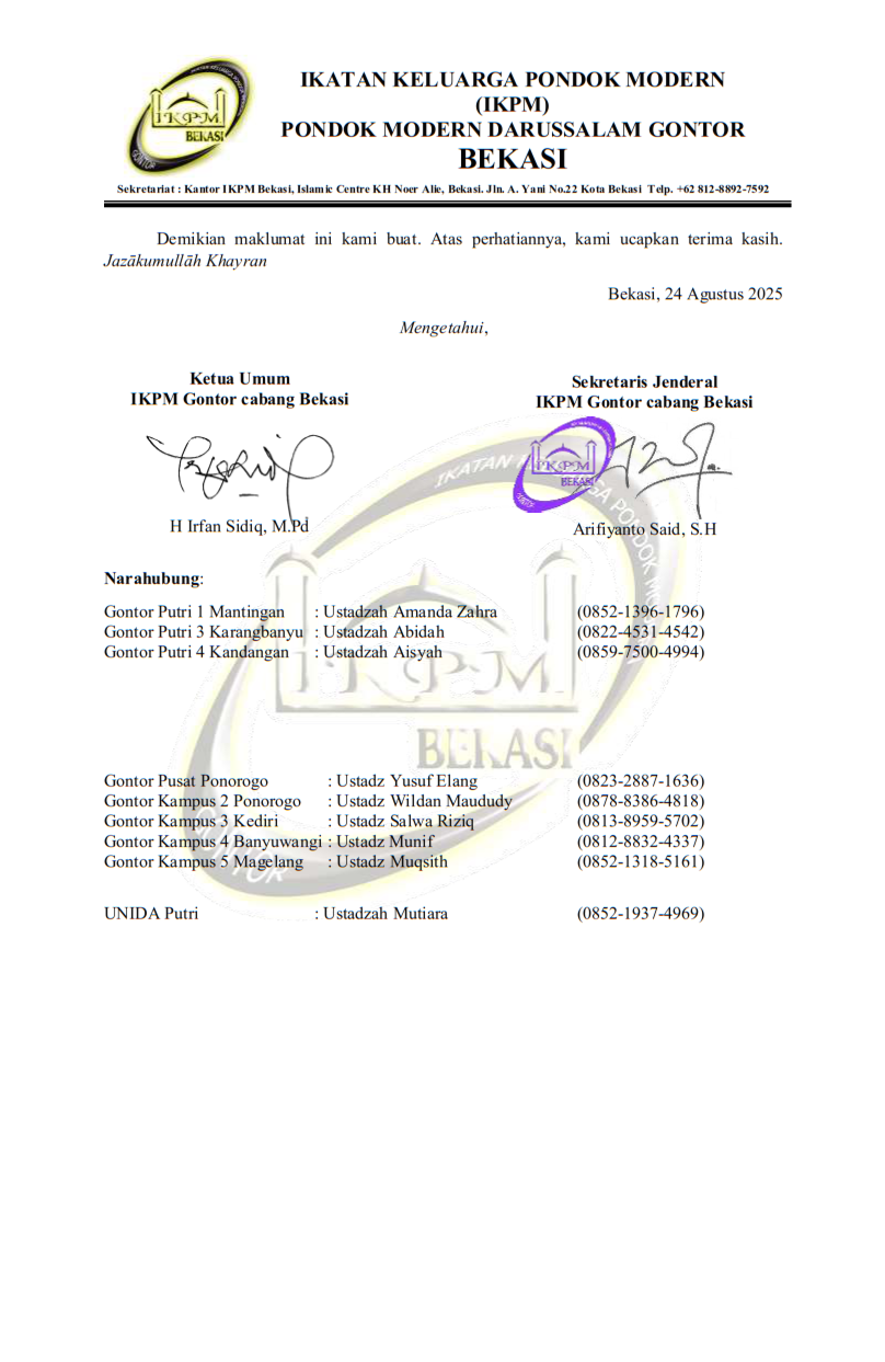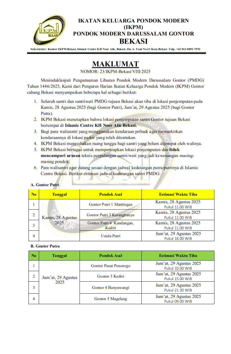 Berikut kami sampaikan Informasi terkait kedatangan Santri Putra dan Santri Putri dari Pondok ke Bekasi di tanggal Kamis-Jum’at, 28-29 Agustus 2025: